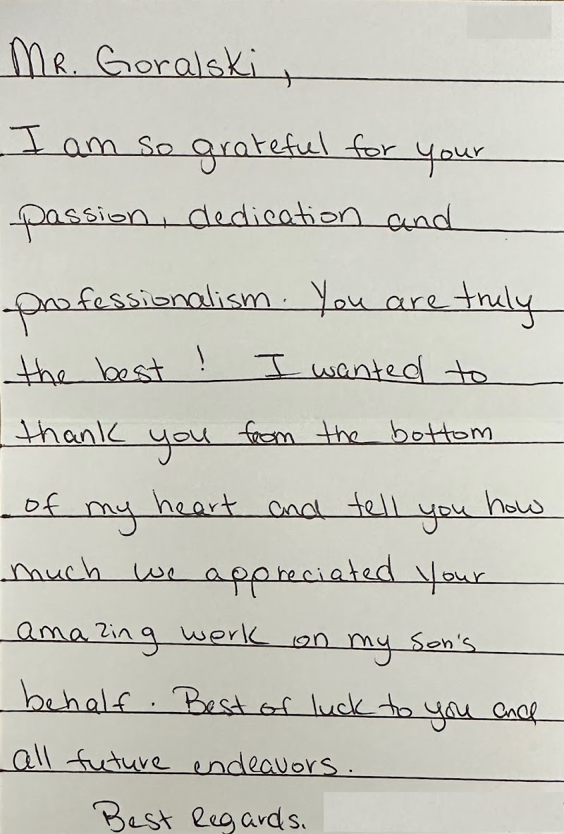 Working with Mr. Steve was one of the best decisions I made. This was my first time ever needing to hire an attorney, and right from the start, he made me feel at ease about my situation. He was on top of everything and took the time to clearly explain all my options and legal rights in detail. I felt informed and supported. I absolutely recommend attorney Steve Goralski!